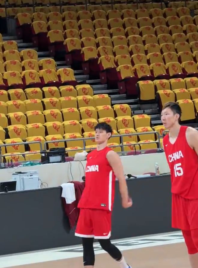比赛前的踩场训练可以看到五棵松体育馆观众席全部换上了应援服。