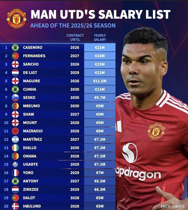 卡塞米罗在曼联的年薪为2100万欧元,这也是球队的顶薪,比排名第二的费尔南德斯整整高出了300万欧元。这个薪资待遇是卡塞米罗在皇马时期的两倍之多,巴西人虽然口头上说他离开皇马不是为了钱,但这也只是他在球迷面前的一种说辞罢了。倘若他想要在皇马获得这样的待遇则是根本不可能的,或者说这样的薪资诱惑加上曼联这个招牌对于绝大多数的球员来说依然还是有着巨大吸引力的。